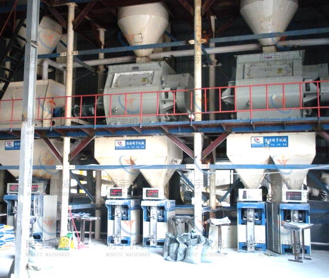 将预先设定的配方输入电脑,水泥沙子等原料根据配比经螺旋输送机输送至配料秤,称量后由斗式提升机提升至卧式无重力搅拌机,混合2-3分钟(根据不同物料混合时间略有差别)后落至成品仓,成品仓下部配全自动称量包装机,将混合好的成品装袋包装。在包装过程中,可以重复上面配料、提升、搅拌等过程,以实现流水线作业,提高生产效率。